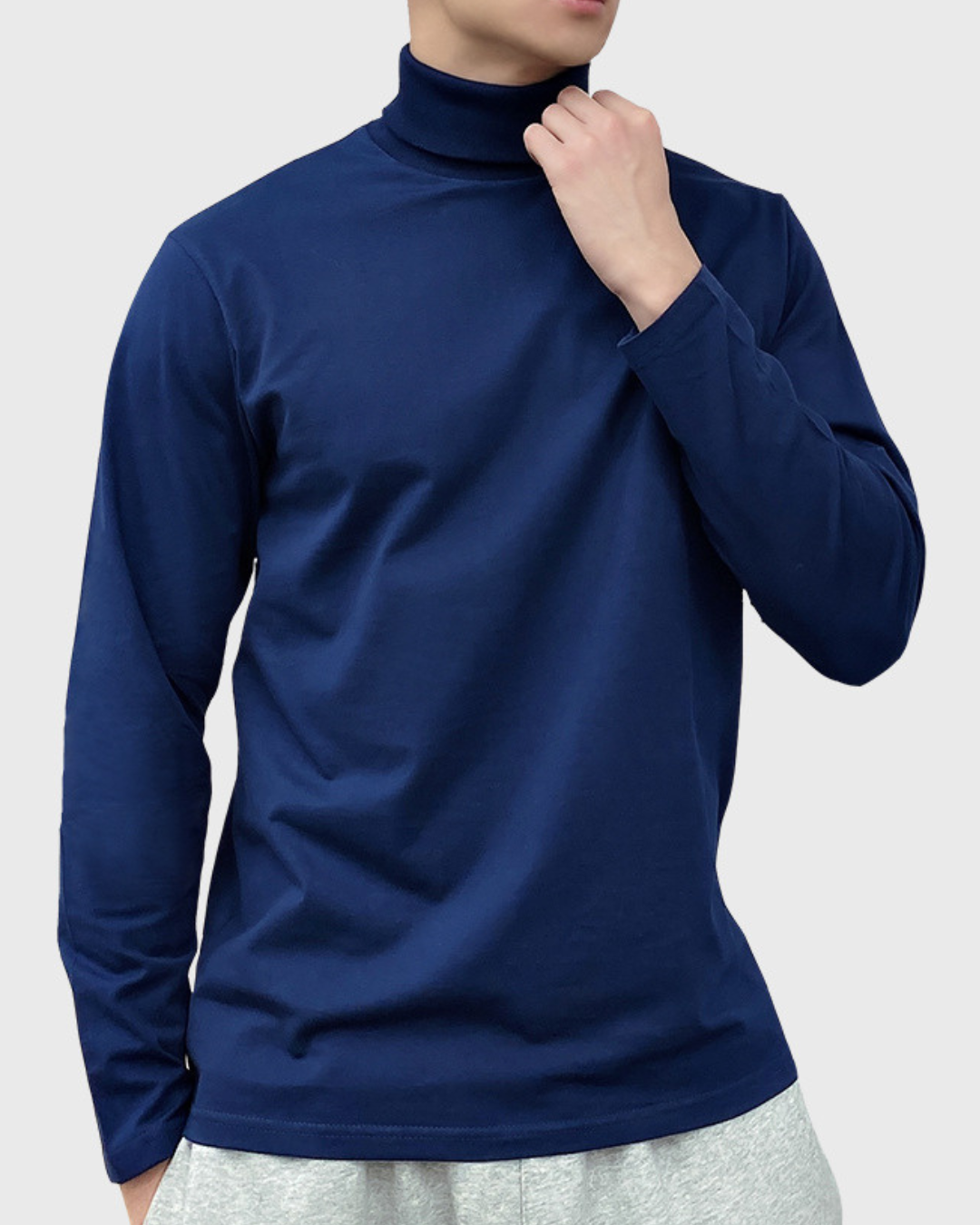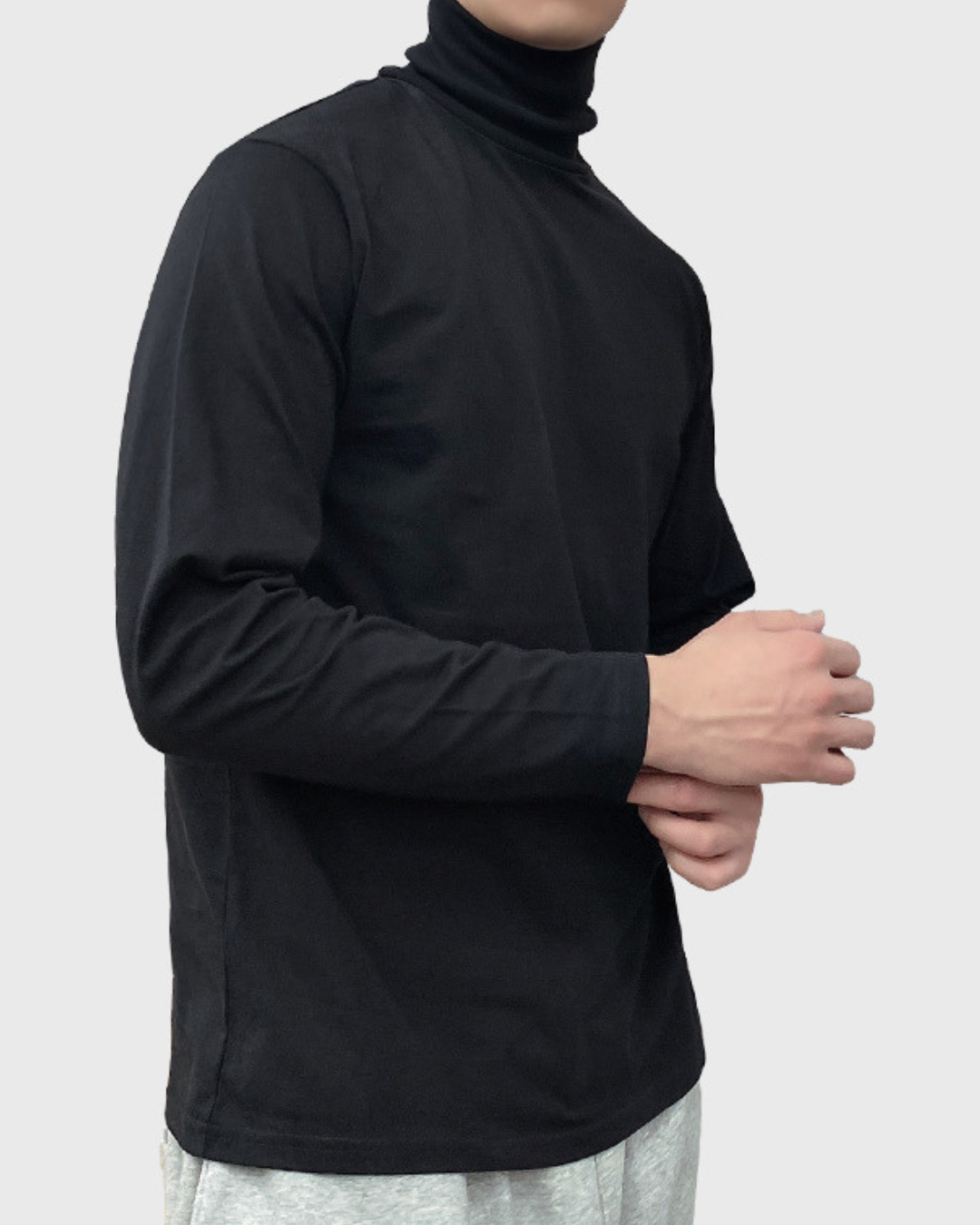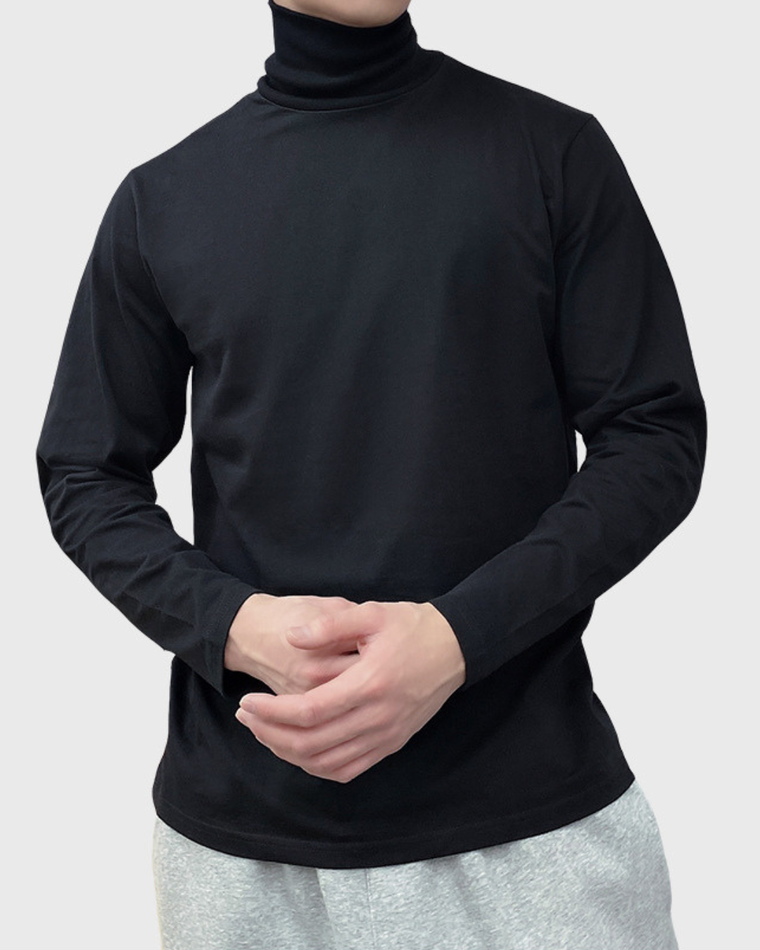 Modelis dėvintis medvilninį ploną golfą yra 1.83m ūgio ir dėvi M dydį.