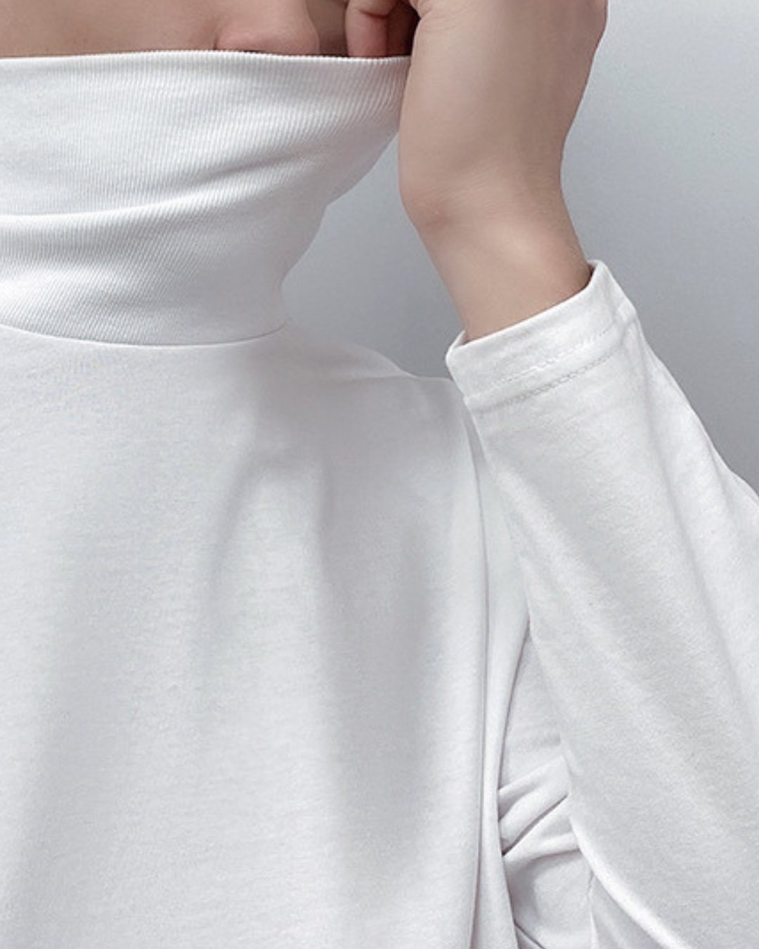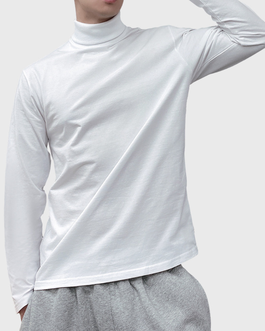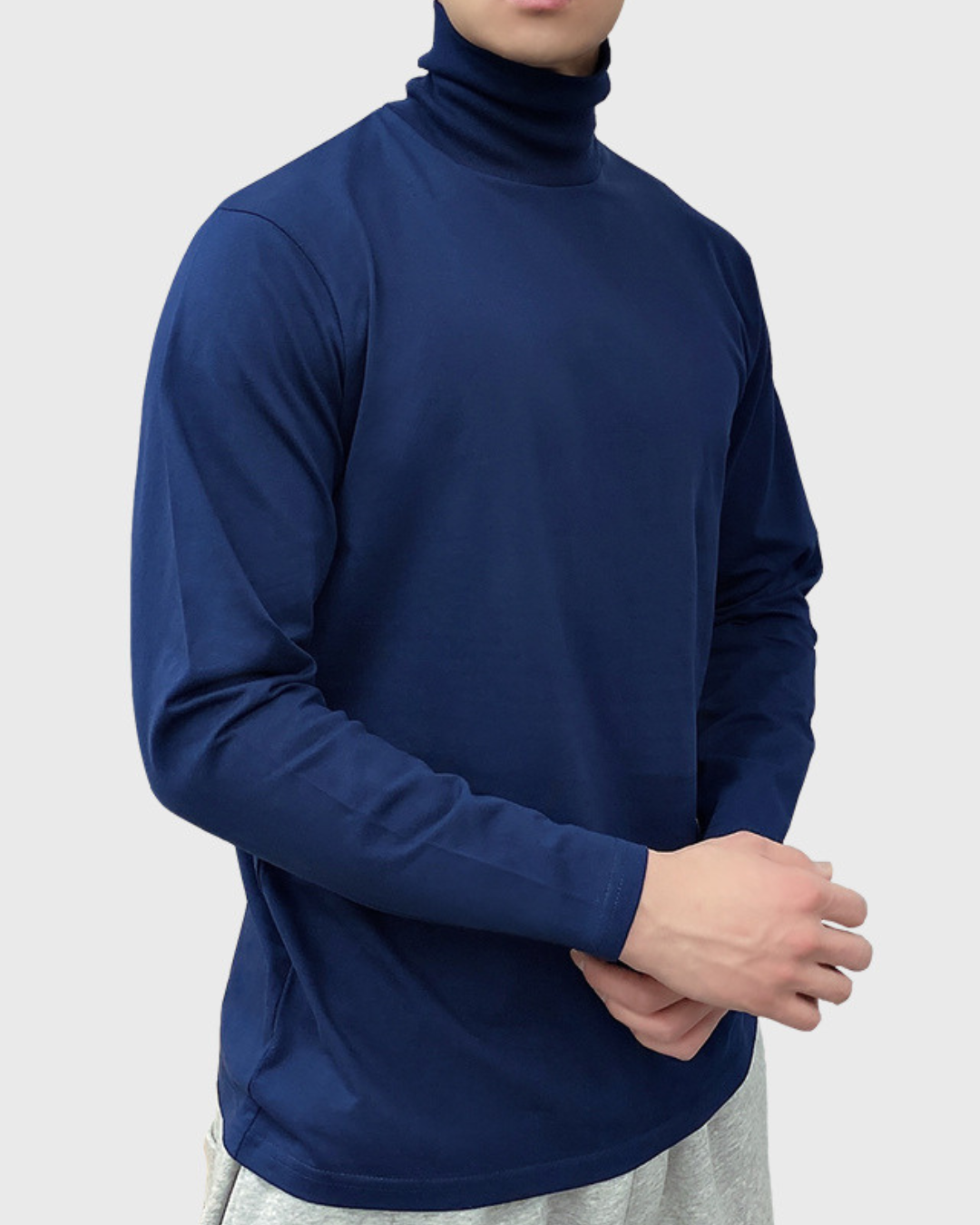 Modelis dėvintis medvilninį ploną golfą yra 1.83m ūgio ir dėvi M dydį.
