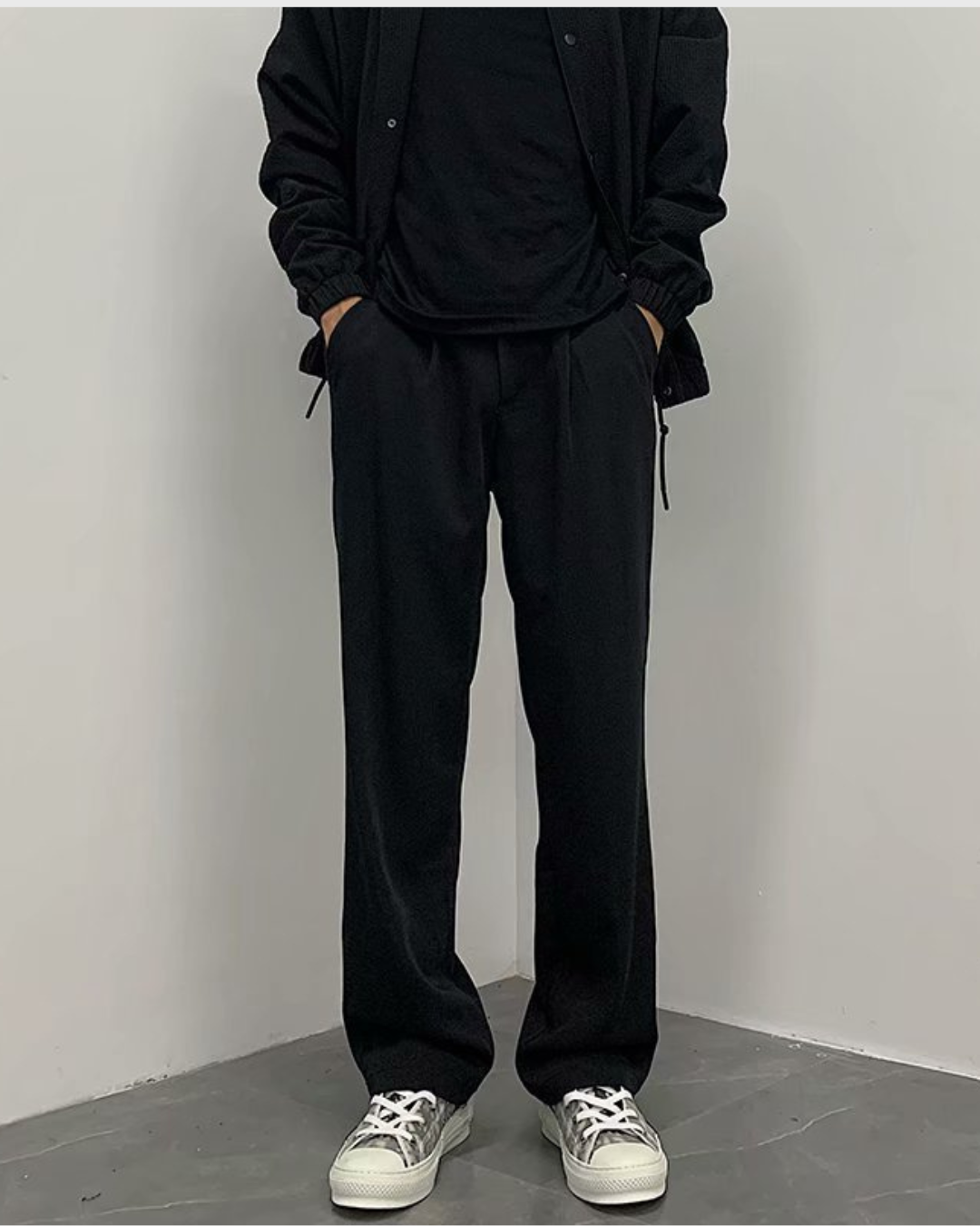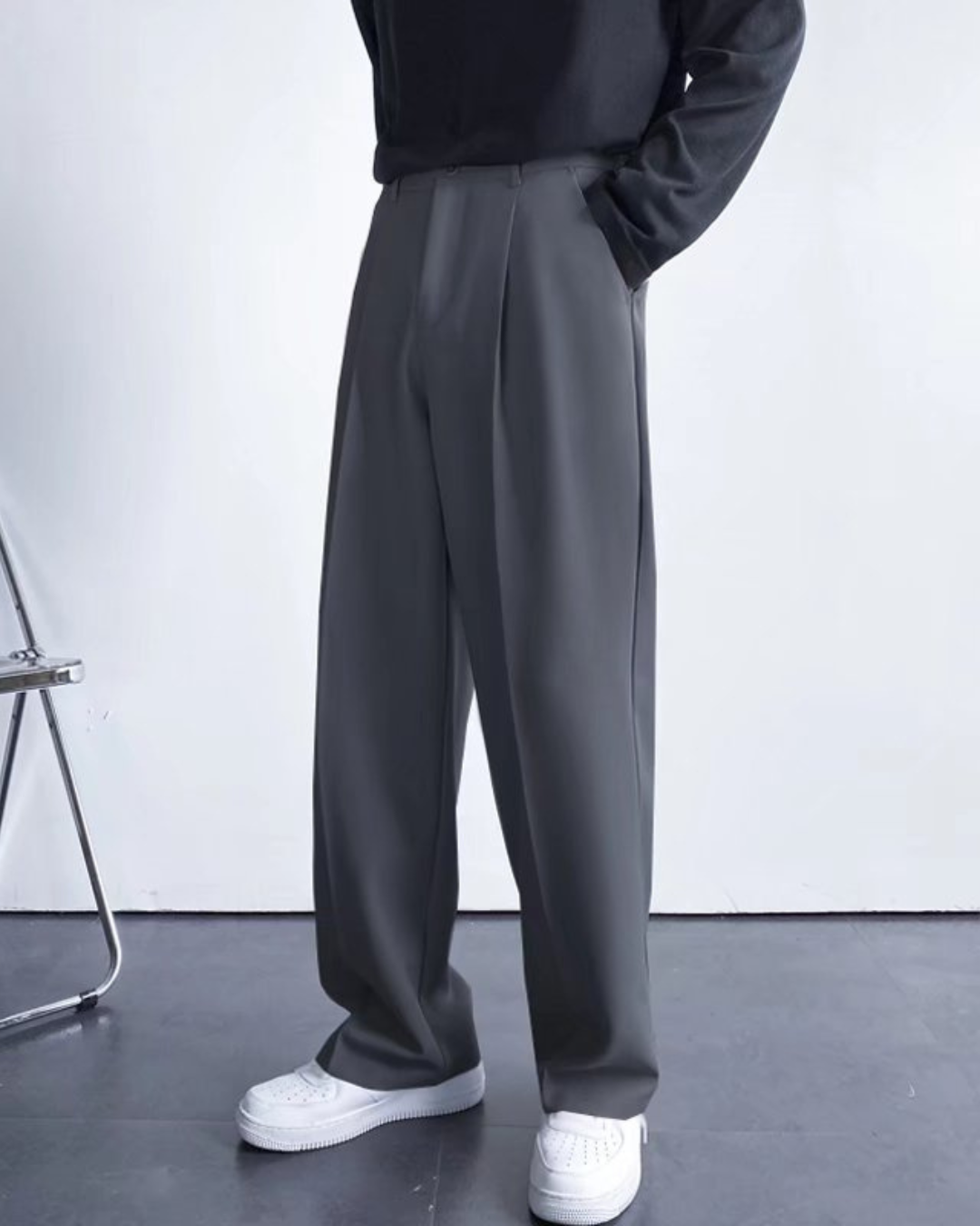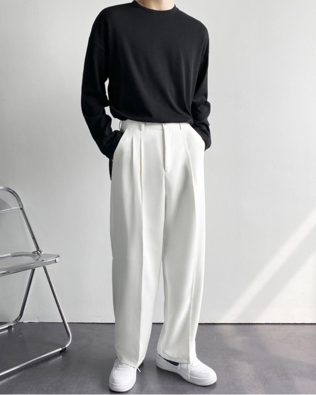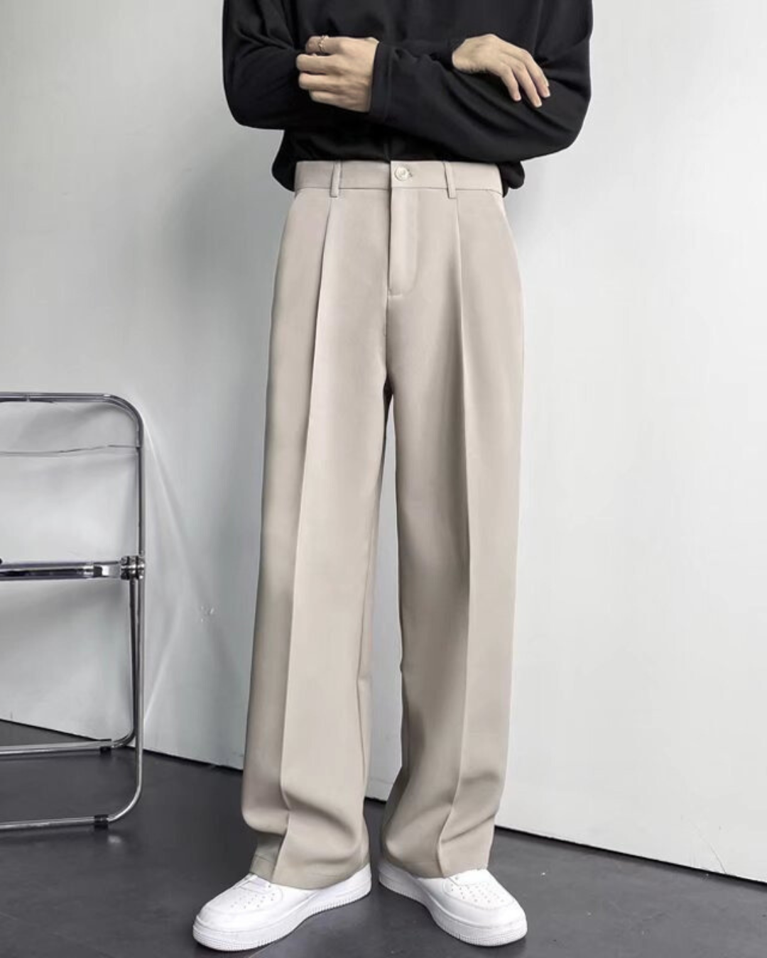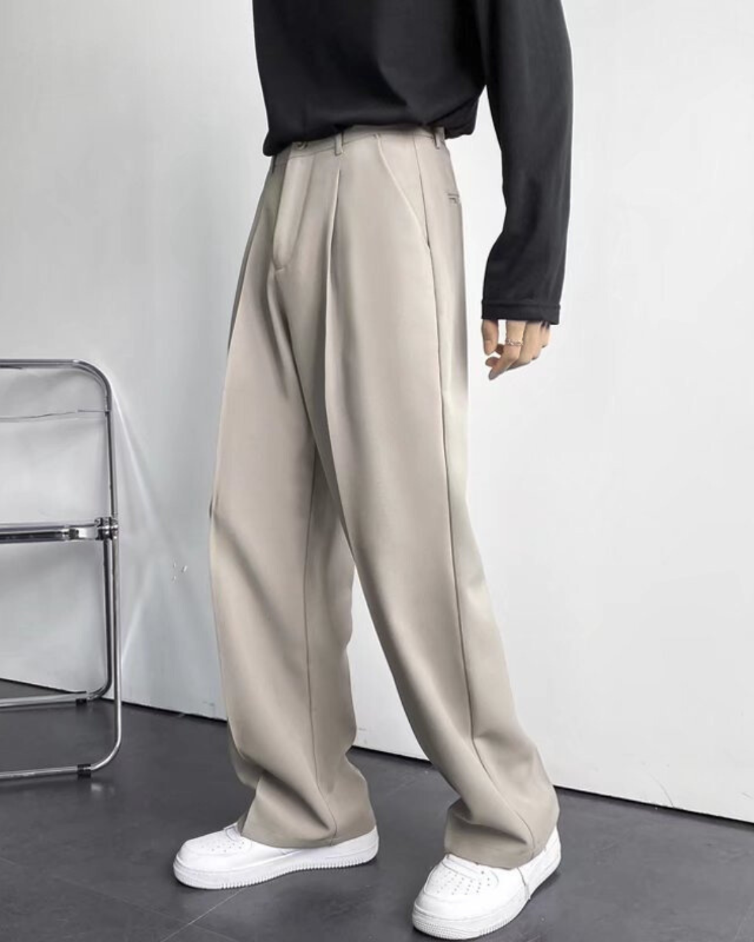 Modelis dėvintis plačias tiesaus kirpimo laisvalaikio kelnes yra 1.85m ūgio ir dėvi L dydį.