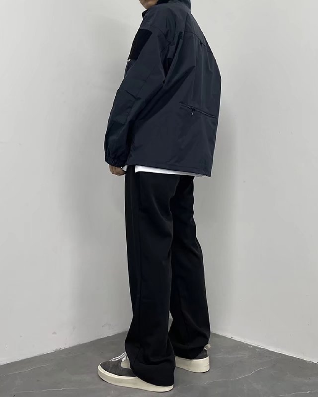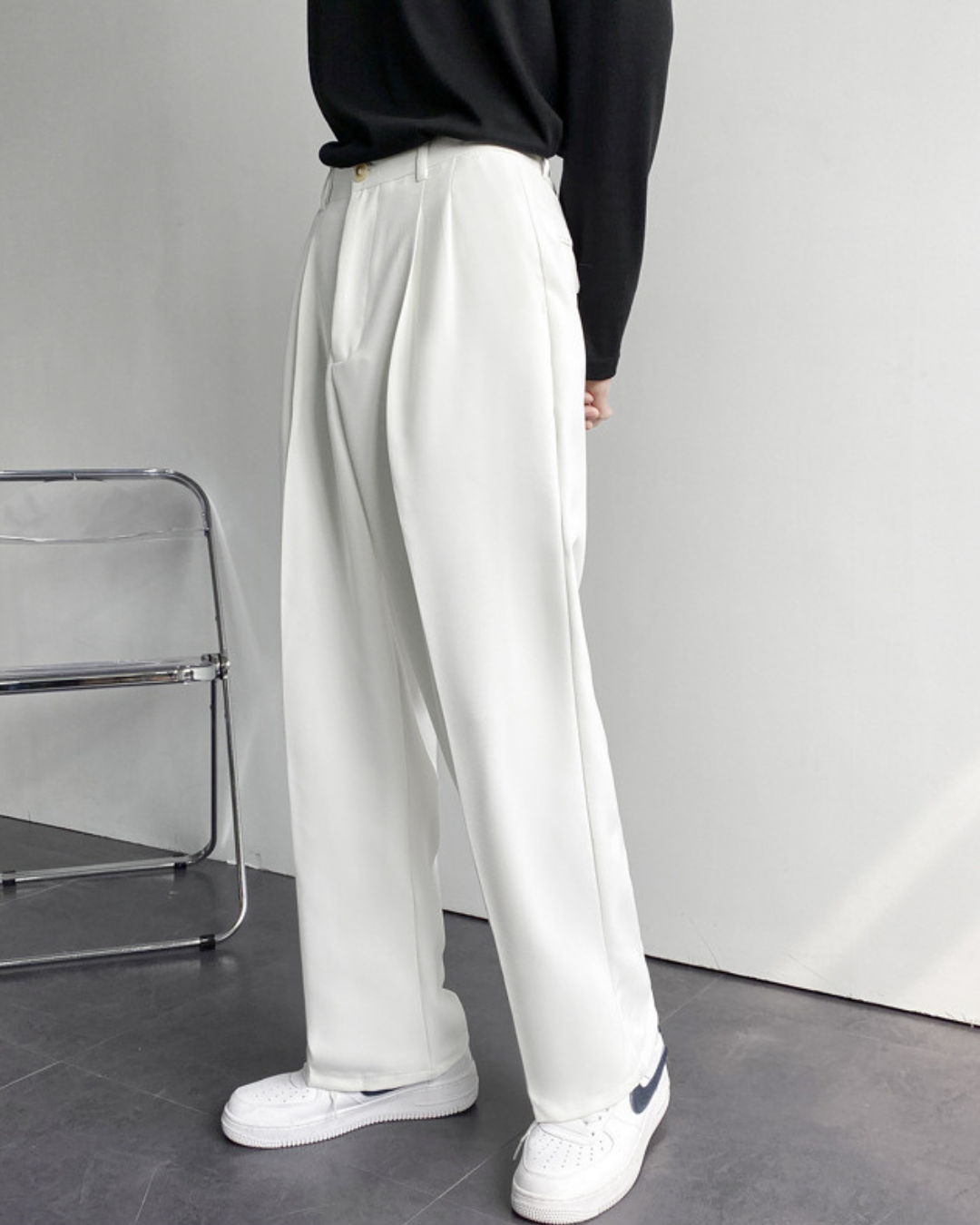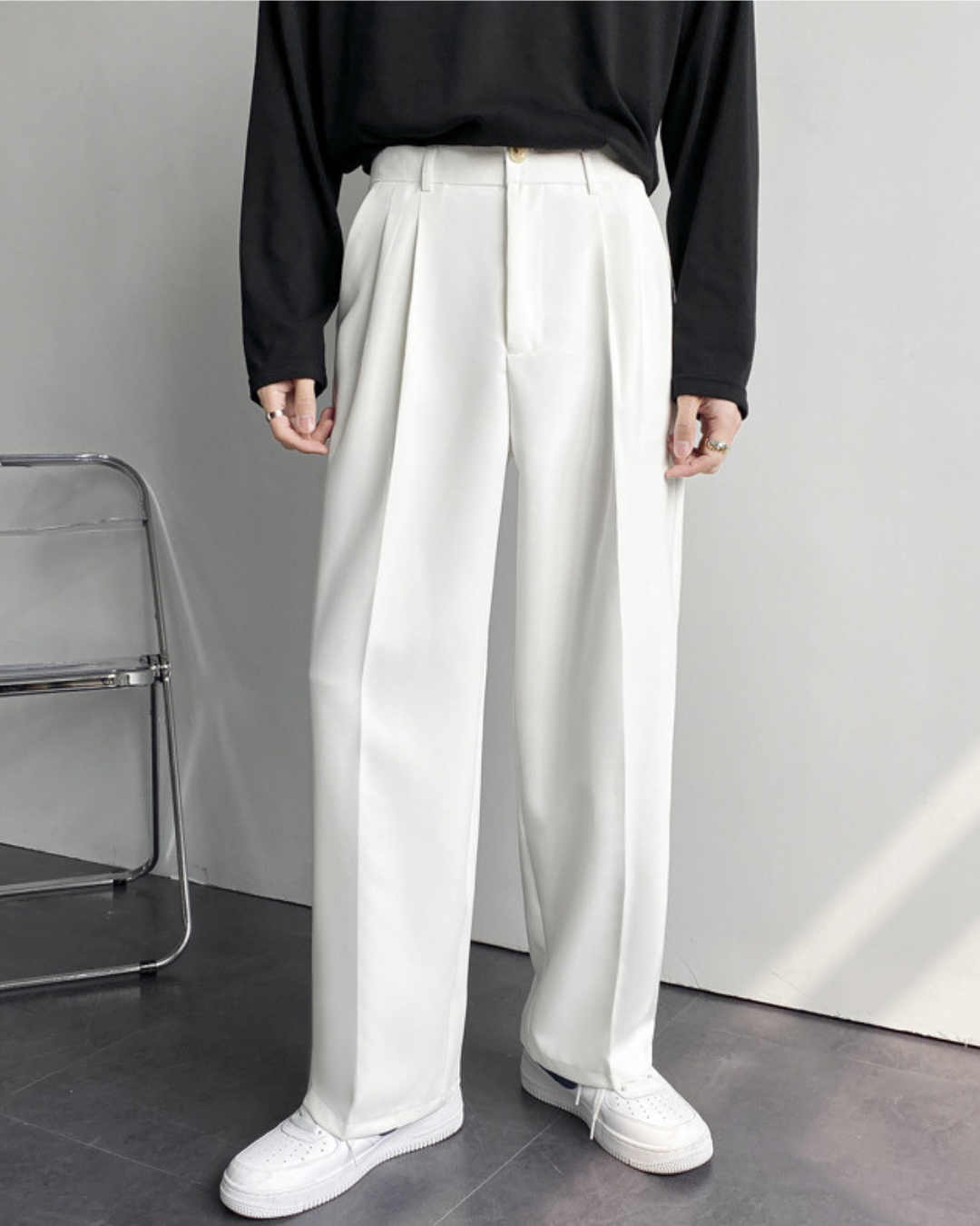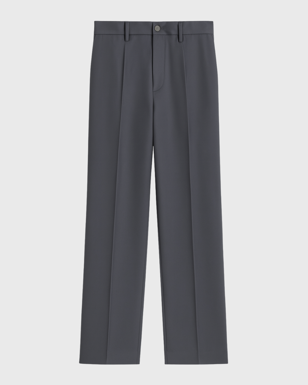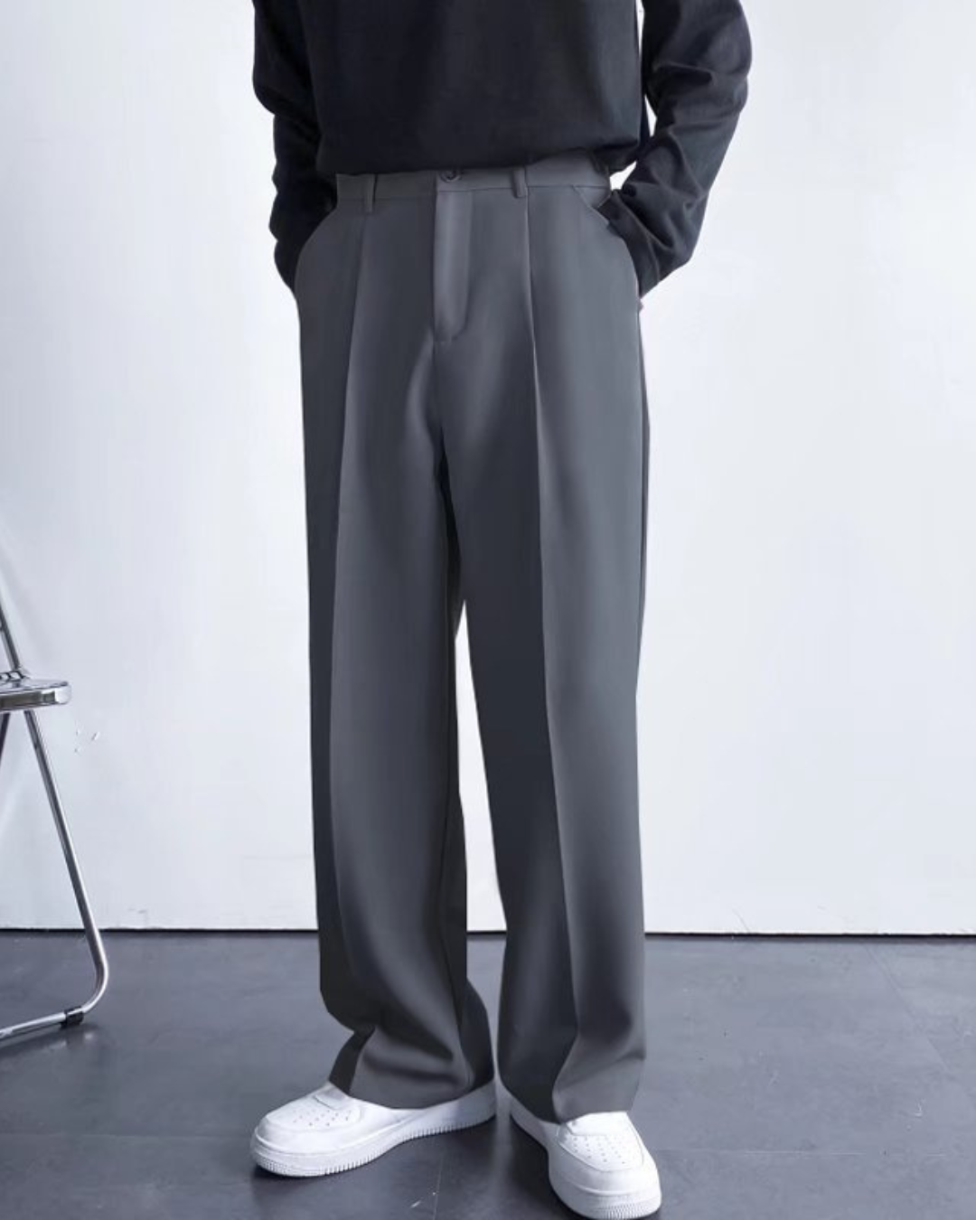 Modelis dėvintis plačias tiesaus kirpimo laisvalaikio kelnes yra 1.85m ūgio ir dėvi L dydį.
